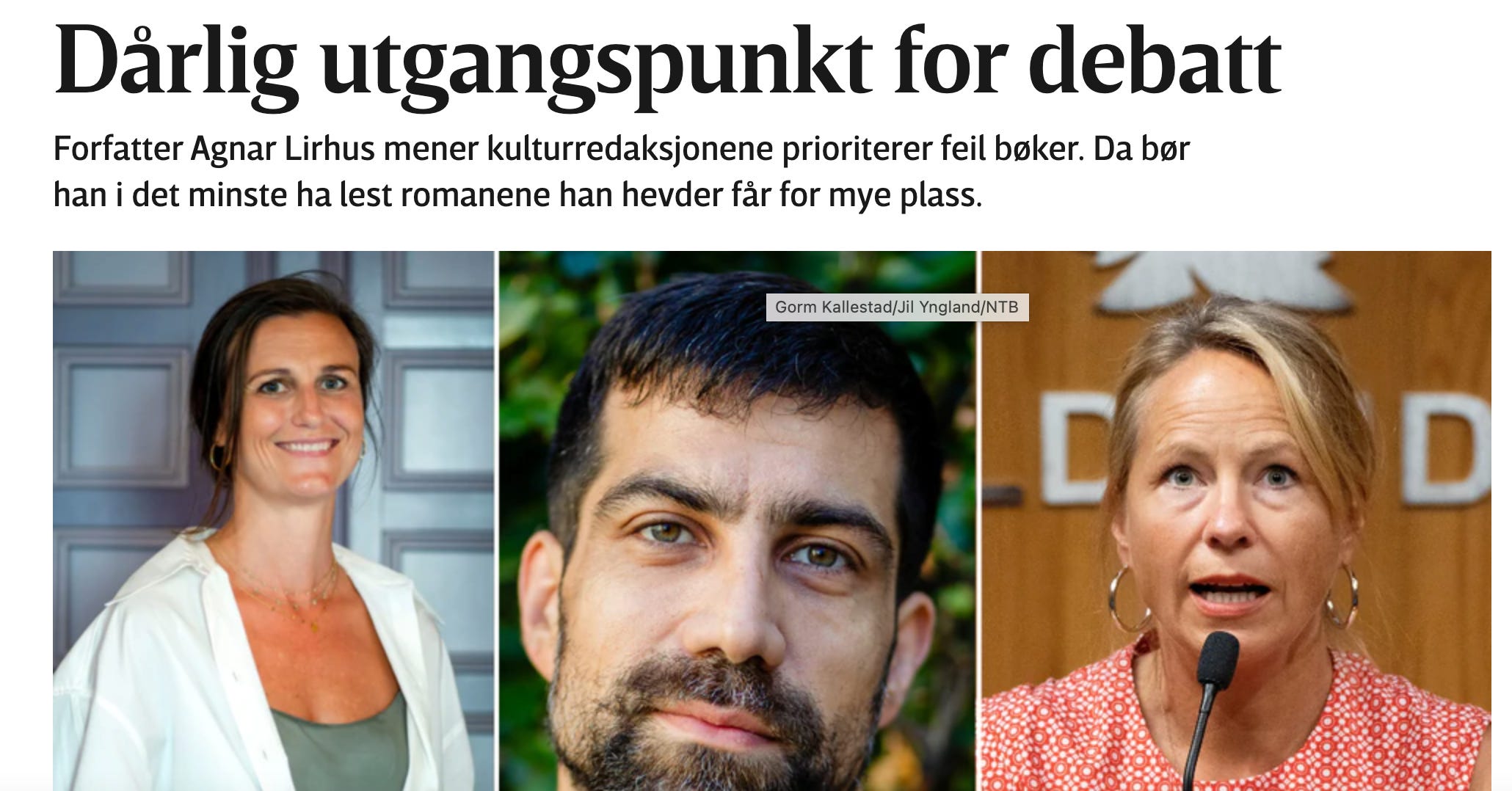 Vårt land går på lederplass i rette med mitt innlegg i Aftenposten, der jeg kritiserer landets kulturredaksjoner for omtrent kun å skrive om bøkene til kjente forfattere. Vårt land mener kritikken er ugyldig siden jeg ikke har lest bøkene disse forfatterne har utgitt i høst.