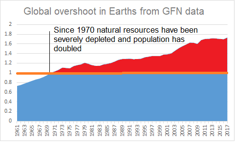 Overgangen fra overtakelse til tæring på reserver medfører samtidig at det økologiske avtrykket til menneskedyrene har blitt langt høyere enn antallet mennesker som lever på jorda skulle tilsi.